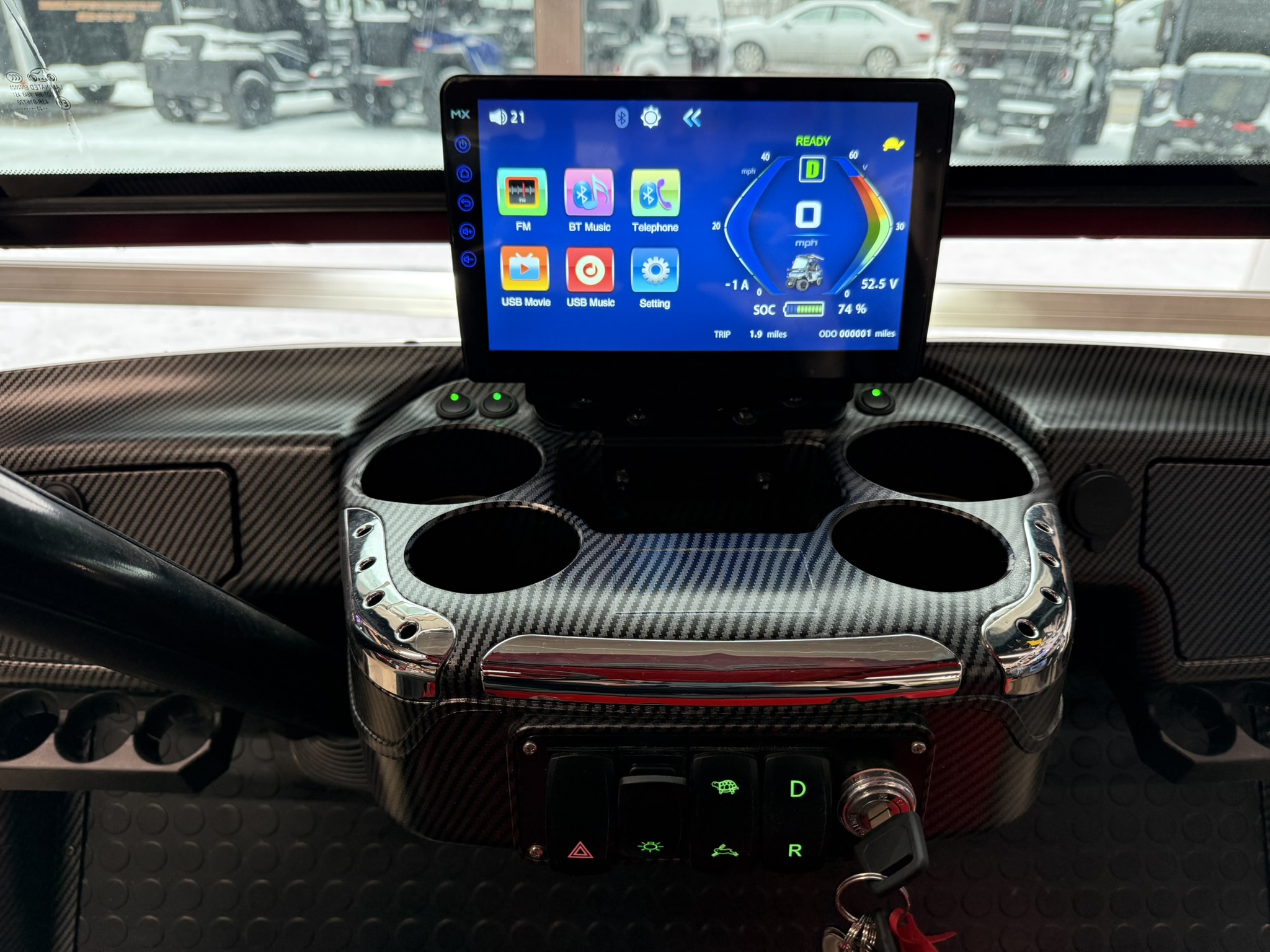 - Luxurious Carbon Fiber Style Dash, Locking Glove Compartments, 10.1” Digital Display Multimedia Touch Screen with IP67 Rating, EcoXGear Bluetooth Sound Bar, Bluetooth, Phone, Radio, Music, Back-up Camera, Forward/Neutral/Reverse Switch, USB and 12V Plugs, Multiple Cup Holders, USB Ports & Pre-Wired 12v Switches, Digital Gauges, Key Switch