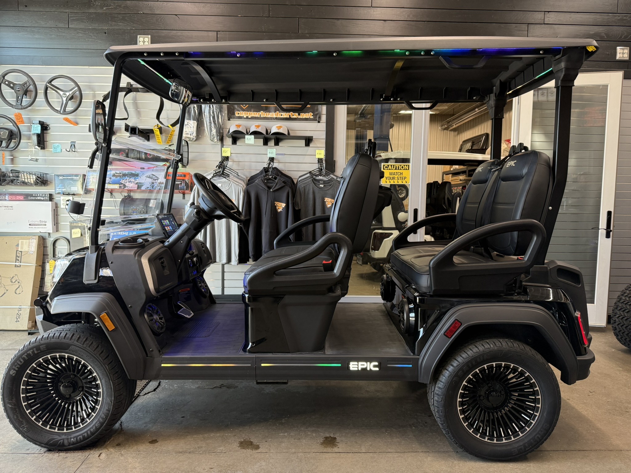 The brand new Epic E40FX is the best cart on the market today! Furnished with every imaginable feature, the forward-facing four-seater Epic E40FX comes in six stylish colors and two height options. Premium 14” wheels and street-ready tires provide a solid foundation for every journey on every terrain, no matter what lift height is selected. With an abundance of storage, superior built-in marine-grade sound system and speakers, and stunning accent lighting, this Epic E40FX golf cart illuminates the possibilities for fun and adventure.